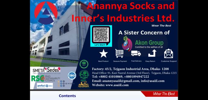 Anannya Socks & Inners Industries Ltd is a sister concern of Akon Group. Our Corporate office Located at 91 Kazi Nazrul Islam Avenue (3rd Floor) Tejgaon, Dhaka-1215. And our factories is located at 45/2 Tejgaon Industrial area,Dhaka-1205. Anannya has been setup by highly educated and well-experienced entrepreneur with excellent track record of Industrial Management, International Marketing as well as Local Business. The current production capacity of this factory is 800000 pcs garments per month. Anannya Socks & Inners Industries Ltd have 50,000 SFT area. It is managed by highly qualified and experienced personnel. Skilled workers are employed for its manufacturing units. The company's success comes from its practice of maintaining the standard of quality, time schedule and meeting the buyer's need. At present Anannya consists 760 family members.